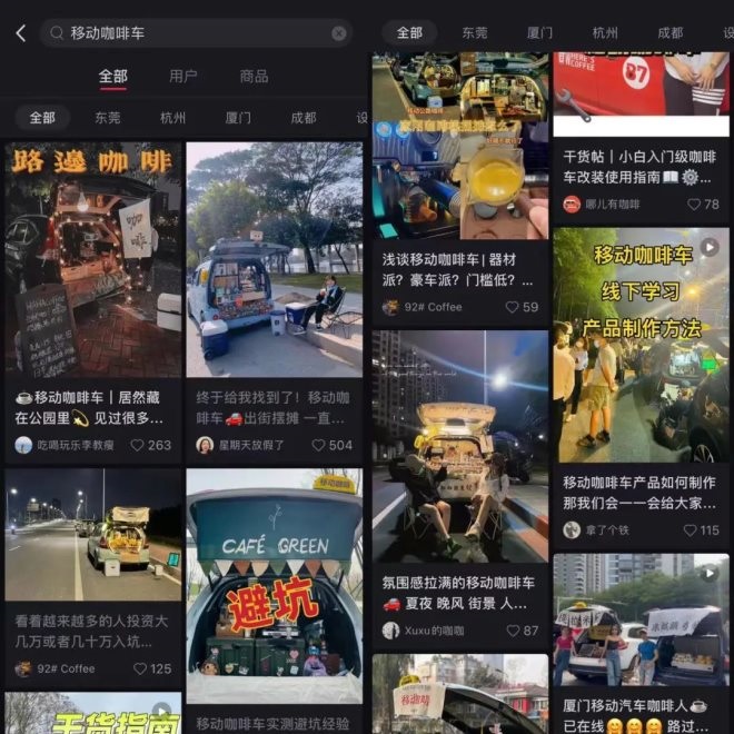 在小紅書搜索“移動(dòng)咖啡車”,就能看見內(nèi)容涉及咖啡車設(shè)備、咖啡車創(chuàng)業(yè)避坑、咖啡車干貨指南等內(nèi)容,城市更是遍布東莞、廈門、杭州、成都等地。