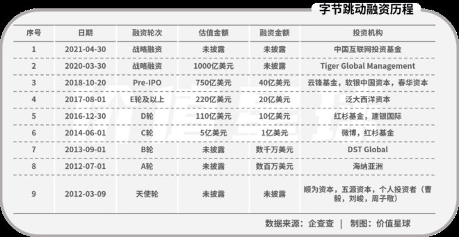字節(jié)跳動的估值自然亮眼,但是卻離不開投資者的“滋養(yǎng)”。企查查數(shù)據(jù)顯示,2012年-2021年,字節(jié)跳動共完成九輪融資。融資規(guī)模與日俱增。比如,2017年字節(jié)跳動獲得20億美元E輪融資,2018年又獲得40億美元Pre-IPO融資。