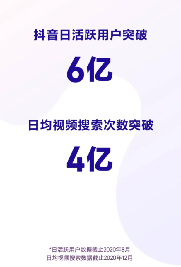 《2020年度抖音數(shù)據(jù)報告》顯示,抖音日活已經(jīng)突破6億。極光數(shù)據(jù)顯示,抖音用戶總?cè)站褂脮r長為441.6億分鐘,簡單測算可知,抖音單用戶日均使用時長為73.6分鐘左右。