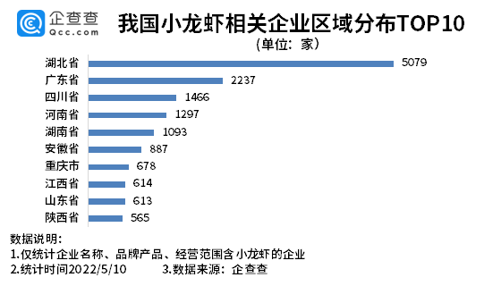 企查查數(shù)據(jù)顯示,從區(qū)域分布來看,湖北省以5079家小龍蝦相關(guān)企業(yè)排名第一。廣東、四川分別擁有2237家、1466家小龍蝦相關(guān)企業(yè),排名前三。此后依次為河南、湖南、安徽、重慶等地。