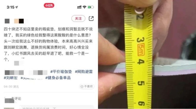 “(瑜伽墊上的)劃痕和洞暫且就不說啥了,我買的綠色給我整得黑黢黢的是什么意思?本來高高興興買來跟劉畊宏跳舞,退換貨純屬浪費(fèi)時間,好心情全沒了,小紅書跟風(fēng)去買的趁早退了吧,能救一個是一個!庇邢M(fèi)者發(fā)布避雷帖稱。