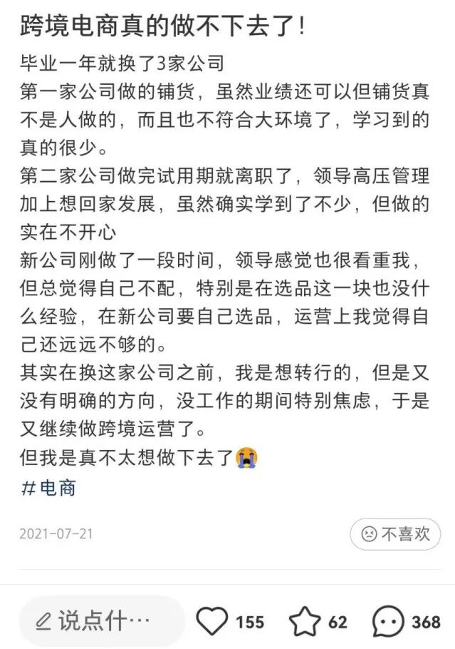 兩次前車之鑒后,冬渝已經開始自我懷疑,并一度有了轉行的念頭:換了幾份工作下來,亞馬遜店鋪運營工作遠比想象中的要復雜與繁瑣;同時壓價招新的行業(yè)環(huán)境也讓她覺得自己像極了“用完就扔的白菜”。