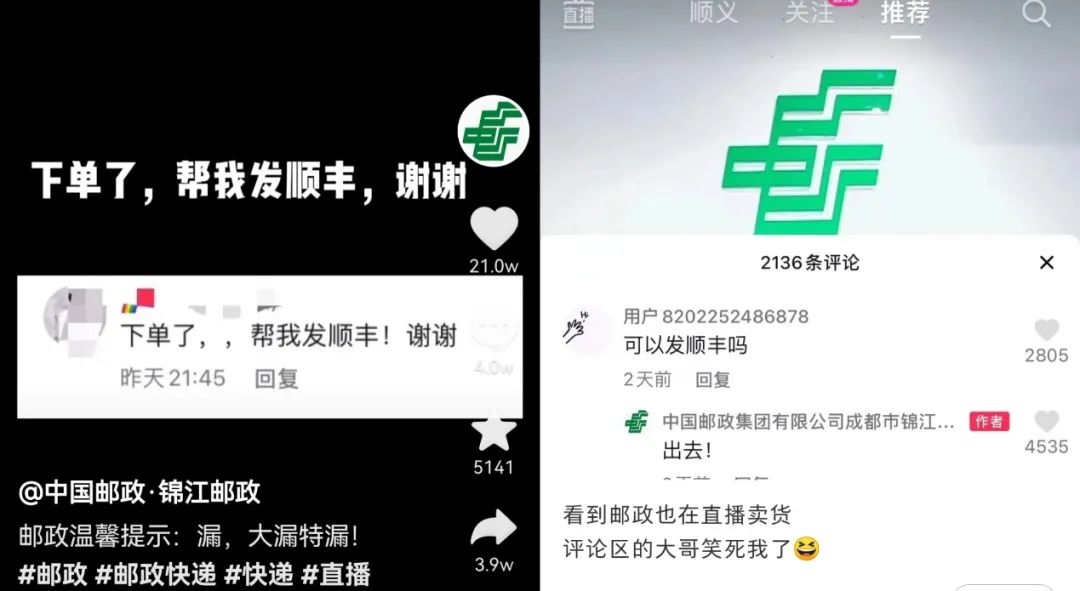 品牌出圈,伴隨著各種偶然性,郵政直播突然在小紅書、抖音等社交平臺(tái)火起來,還是因?yàn)椤绊権S梗”——在錦江郵政的抖音直播間中,有網(wǎng)友詢問:“下單了,能不能發(fā)順豐?”錦江郵政用調(diào)侃的語氣懟了回去:“出去出去!”