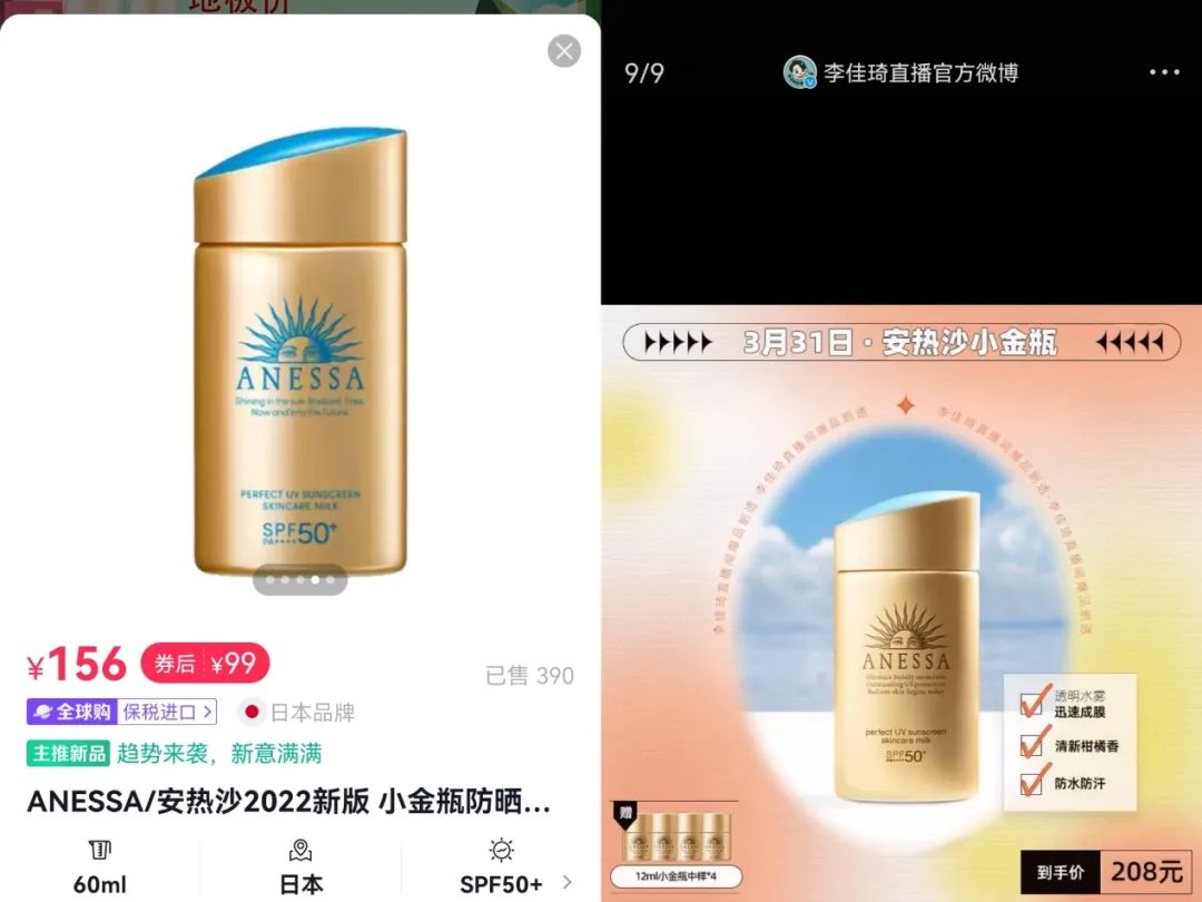 又比如,在李佳琦5月8日的直播間中,一瓶安熱沙小金瓶防曬,加上4個(gè)12ml的小樣,到手價(jià)208元,1ml大約1.92元;而在錦江郵政的直播間中,一瓶安熱沙防曬只需要99元,1ml是1.65元。