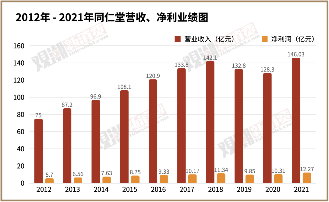 最直觀從業(yè)績(jī)上看,2012年后,同仁堂營(yíng)收凈利潤(rùn)增速放緩,營(yíng)收和凈利潤(rùn)在2018年之后的兩年也停止了增長(zhǎng)。