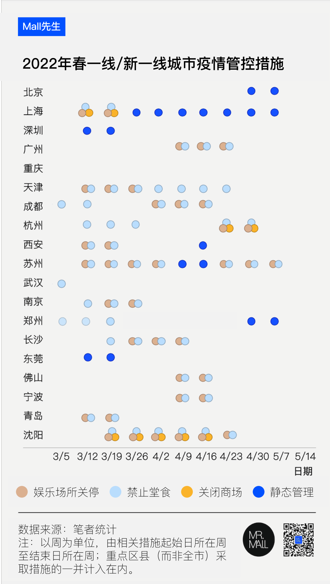 我們做了個不完全統(tǒng)計,從3月以來,除了重慶以外,所有的18個一線和新一線城市,都在全市或局部區(qū)縣范圍內(nèi)采取過較為嚴(yán)格的管控措施。