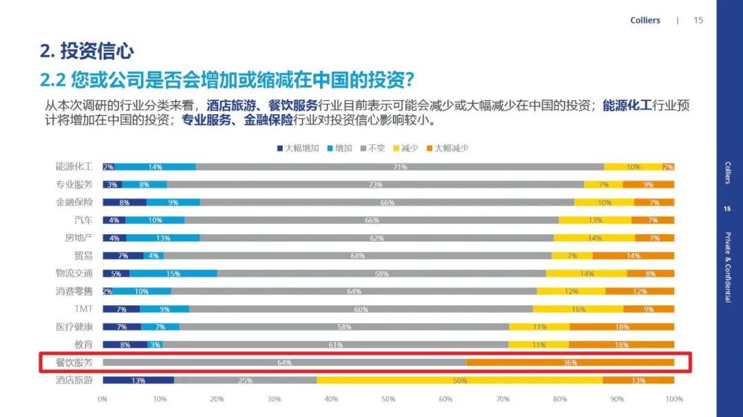 更令人擔(dān)憂的是,在被問及“您或公司是否會增加或縮減在中國的投資?”時,36%的餐飲服務(wù)類公司受訪者選擇了“大幅減少”、64%選擇了“不變”。