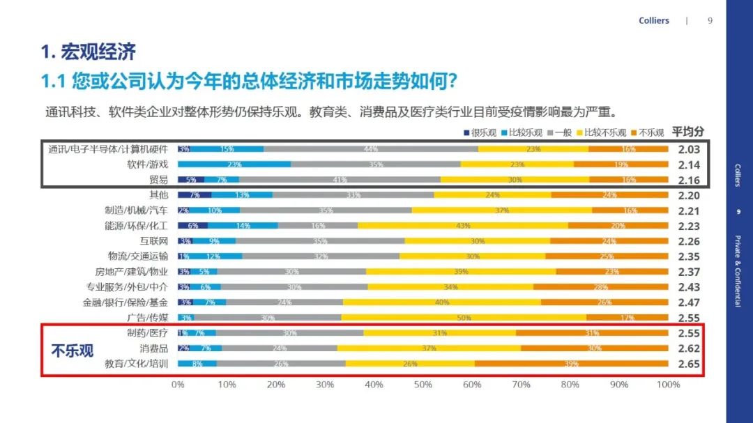 其中,消費(fèi)品行業(yè)的消極態(tài)度占比達(dá)到了67%,僅有不到9%的受訪者持“樂觀”或者“比較樂觀”態(tài)度。