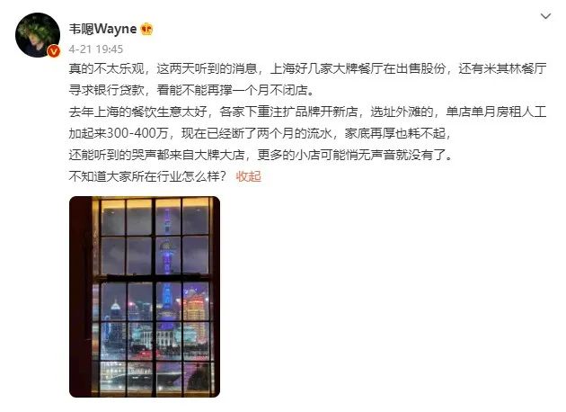 美食博主韋嗯Wayne在微博上表示:“上海好幾家大牌餐廳在出售股份,還有米其林餐廳尋求銀行貸款,看能不能再撐一個月不閉店!
