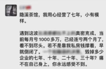 網(wǎng)傳上海隱溪茶館的老板發(fā)朋友圈吐槽,“每月虧1,000多萬,已經(jīng)連虧2個月了,看不到盡頭。”