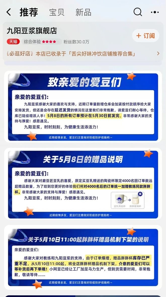 從九陽豆?jié){的淘寶官方旗艦店銷量數(shù)據(jù)中,也能窺見這次代言的帶貨力,磨豆匠豆乳作為劉畊宏代言的主要產(chǎn)品,在淘寶已完成了月銷2萬+的成績,店鋪首頁更是連掛3條說明,感謝網(wǎng)友對(duì)教練和九陽豆?jié){的支持。