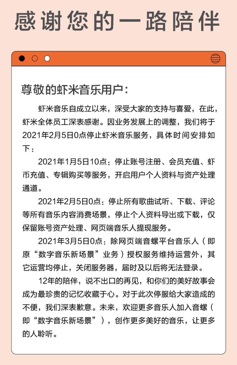 2021年1月5日,蝦米音樂終于通過其官方微博宣布:因業(yè)務(wù)發(fā)展上的調(diào)整,將于2月5日0點停止蝦米音樂服務(wù)。至此,這款曾經(jīng)口碑爆棚的產(chǎn)品宣告死亡。