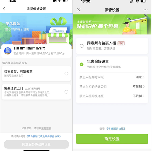 圖為用戶端菜鳥(niǎo)和豐巢收貨偏好設(shè)置頁(yè)面