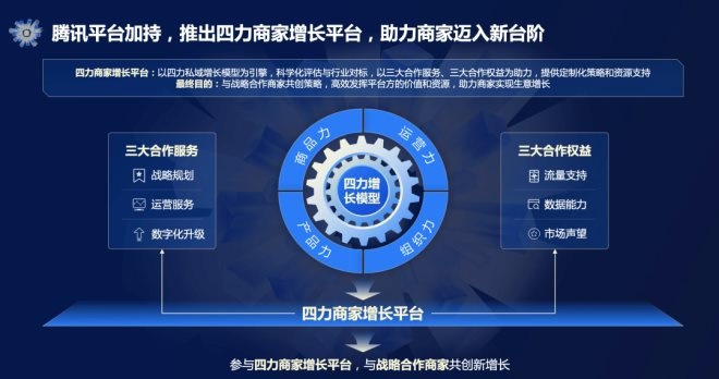 私域高速發(fā)展背后,騰訊智慧零售沉淀出底層方法論——四力增長(zhǎng)模型,并由此發(fā)展為“四力商家增長(zhǎng)平臺(tái)”,會(huì)上騰訊智慧零售團(tuán)隊(duì)首次對(duì)平臺(tái)價(jià)值進(jìn)行了詳細(xì)闡述。該平臺(tái)以四力增長(zhǎng)模型為引擎,科學(xué)化評(píng)估與行業(yè)對(duì)標(biāo),涵蓋戰(zhàn)略規(guī)劃、運(yùn)營(yíng)服務(wù)、數(shù)字化升級(jí)三大合作服務(wù)以及流量支持、數(shù)據(jù)能力、市場(chǎng)聲望三大合作權(quán)益,為品牌商家提供定制化策略和資源支持。