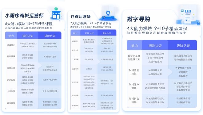 其中,小程序商城運(yùn)營(yíng)師將圍繞商城、商品、活動(dòng)、會(huì)員、數(shù)據(jù)等維度開(kāi)展能力進(jìn)階培訓(xùn);社群運(yùn)營(yíng)師將從場(chǎng)景、數(shù)據(jù)、流量、工具等層面助力培養(yǎng)精細(xì)化社群運(yùn)營(yíng)操盤手;數(shù)字導(dǎo)購(gòu)則圍繞微信生態(tài)工具的使用、流量挖掘、客戶管理及轉(zhuǎn)化打造金牌導(dǎo)購(gòu)。據(jù)悉,目前首批內(nèi)測(cè)學(xué)員名額已開(kāi)放。