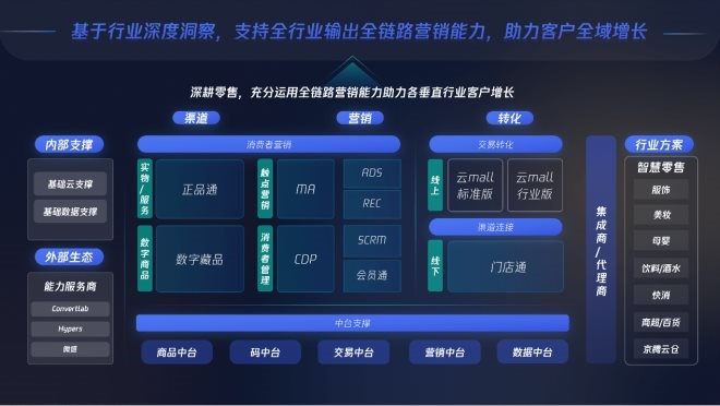 產(chǎn)品工具層面,騰訊云提供的基礎(chǔ)IaaS及PaaS層能力為頭部商家生意構(gòu)建穩(wěn)固的地基;騰訊云提供的安全防護(hù)能力,可有效抵御黑客和羊毛黨,為小程序商城的穩(wěn)定、可靠保駕護(hù)航;云Mall將助力一站式打通微信生態(tài)全觸點(diǎn);營(yíng)銷云將助力商家建立消費(fèi)者全生命周期管理和長(zhǎng)久的消費(fèi)者關(guān)系。