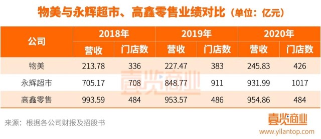 數據顯示,2018-2020年期間,物美營收分比為213.78億元、227.47億元和245.83億元。不僅營收增長緩慢,相比永輝、高鑫零售兩大競爭對手,物美也有著不小的差距。