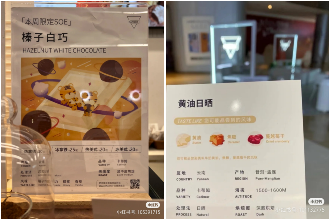 精品咖啡門店如Seesaw、Manner等也推出了云南咖啡產(chǎn)品,均突出所選用咖啡豆的風(fēng)味特點(diǎn),并在基礎(chǔ)上與門店飲品做融合。