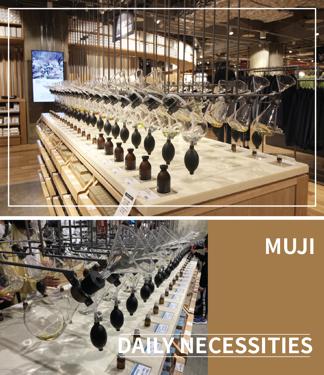 另外,該店還擴充了可讓身體得到放松的精油品類,并通過提煉用的三角燒瓶提供試聞服務(wù),成為賣場的亮點之一。