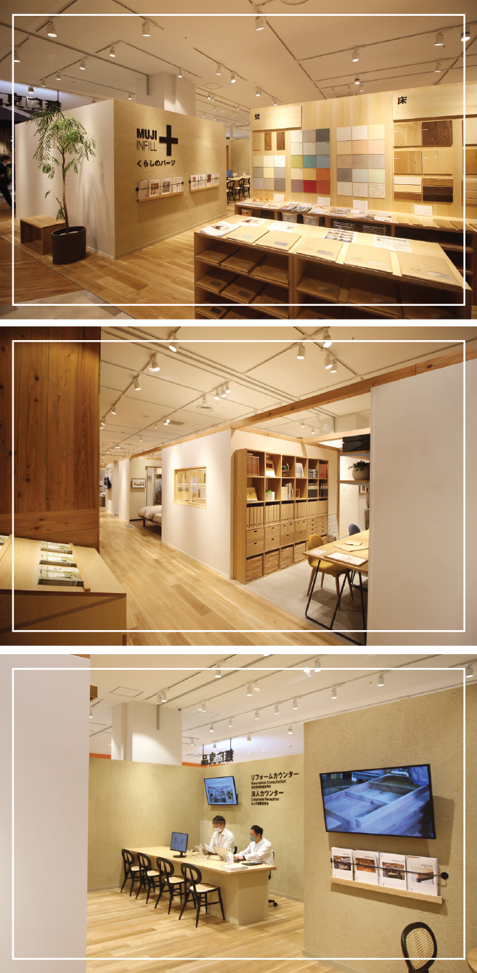 該店強化了空間設(shè)計與裝修等服務(wù),MUJI INFILL+為住宅、辦公室、商業(yè)設(shè)施、公共空間打造舒適個性的空間設(shè)計。住宅改造包括廚房、客廳、餐廳、起居室、書房等部分或整體改造,并提供相關(guān)的五金建材用品。