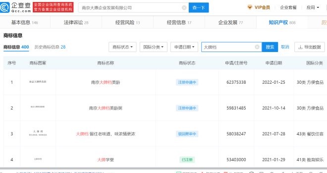 企查查APP顯示,“南京大牌檔”創(chuàng)立于1994年,南京大惠企業(yè)發(fā)展有限公司申請(qǐng)了包括“大牌檔”、“檔牌大”、“美齡粥”在內(nèi)的646個(gè)商標(biāo),其中已成功注冊(cè)398個(gè)。其中“大牌檔”和“大牌檔”的商標(biāo)分別于2001年11月1日和2012年5月9日申請(qǐng),并獲得了商標(biāo)專用權(quán)。
