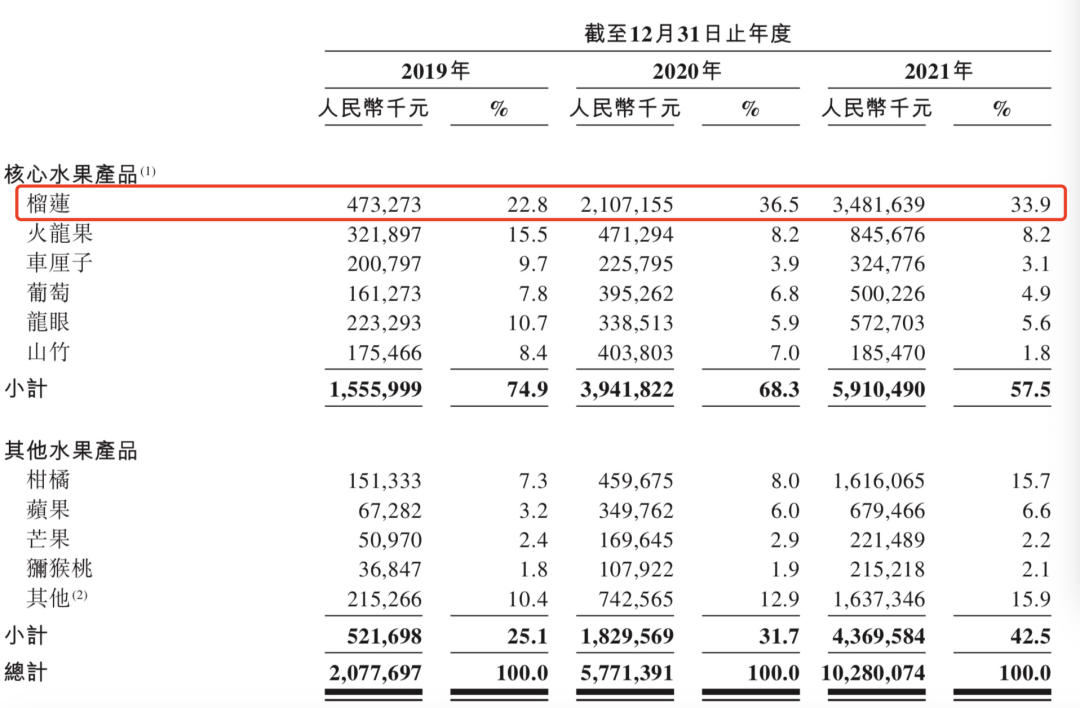 2019、2020及2021,六大核心水果產(chǎn)品的銷售額分別為15.6億、39.4億及59.1億,營收占比分別達74.9%、68.3%、57.5%。作為中國最大的榴蓮分銷商,洪九果品的榴蓮在2020、2021年,單項銷量占比就達到了36.5%、33.9%。雖有下降趨勢,但洪九果品為滿足消費者多樣化需求,正不斷擴充品類。