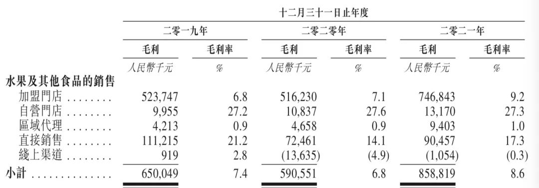 百果園的毛利率為9.8%、9.1%和11.2%,這些數(shù)值為綜合毛利率。在2021年,百果園加盟門店端毛利率約為9.2%,自營門店則是27.3%。然而,9.2%都是百果園銷售給加盟門店商品的毛利率,而不是加盟門店的,百果園從加盟門店獲取的收入,相當(dāng)于加盟門店的成本。
