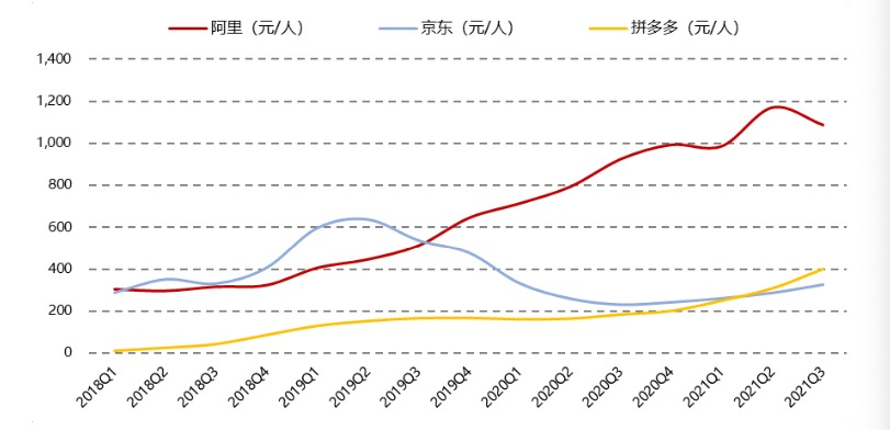華創(chuàng)證券根據(jù)2021年三季度的數(shù)據(jù)測算,阿里獲客成本約1088元/人,京東327元/人,拼多多400元/人,較20年同期分別增18%、41%和118%。