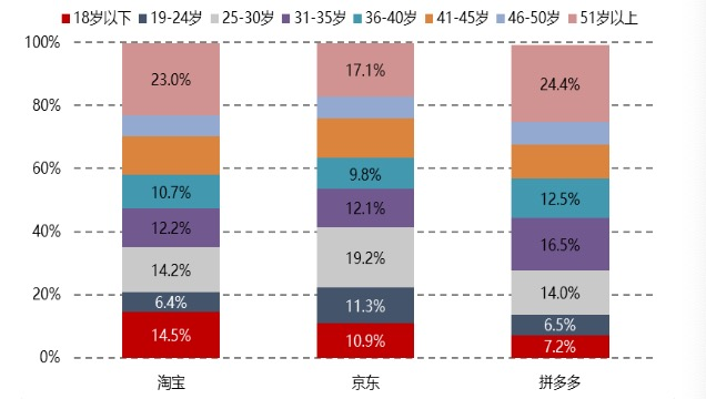 華創(chuàng)證券分析2021年互聯(lián)網(wǎng)平臺(tái)新增用戶年齡分布認(rèn)為,相比淘寶和拼多多,京東的主要新增用戶年齡段在19-30歲,而淘寶18歲以下群體占比較高,拼多多占比較高的則為中老年用戶。