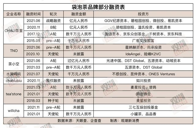在前兩年,袋泡茶在融資市場上也掀起過一輪投資“小高潮”,其中茶里已獲得8輪融資,僅去年6月一次融資金額就高達數(shù)億人民幣,投資方為紀源資本、碧桂園創(chuàng)投等。