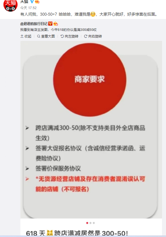 一位從事相關(guān)電商運營維護的人士對「松果財經(jīng)」表示,“干了這么久的電商運營,之前淘寶天貓大促都是“滿200減20”,也就是最近幾年開始“滿200減30”。今年618大促“滿300減50”的優(yōu)惠力度是首次,這相當于我們商家基本上沒有利潤賺錢,甚至有些商品估計都要用拿貨價去賣了!