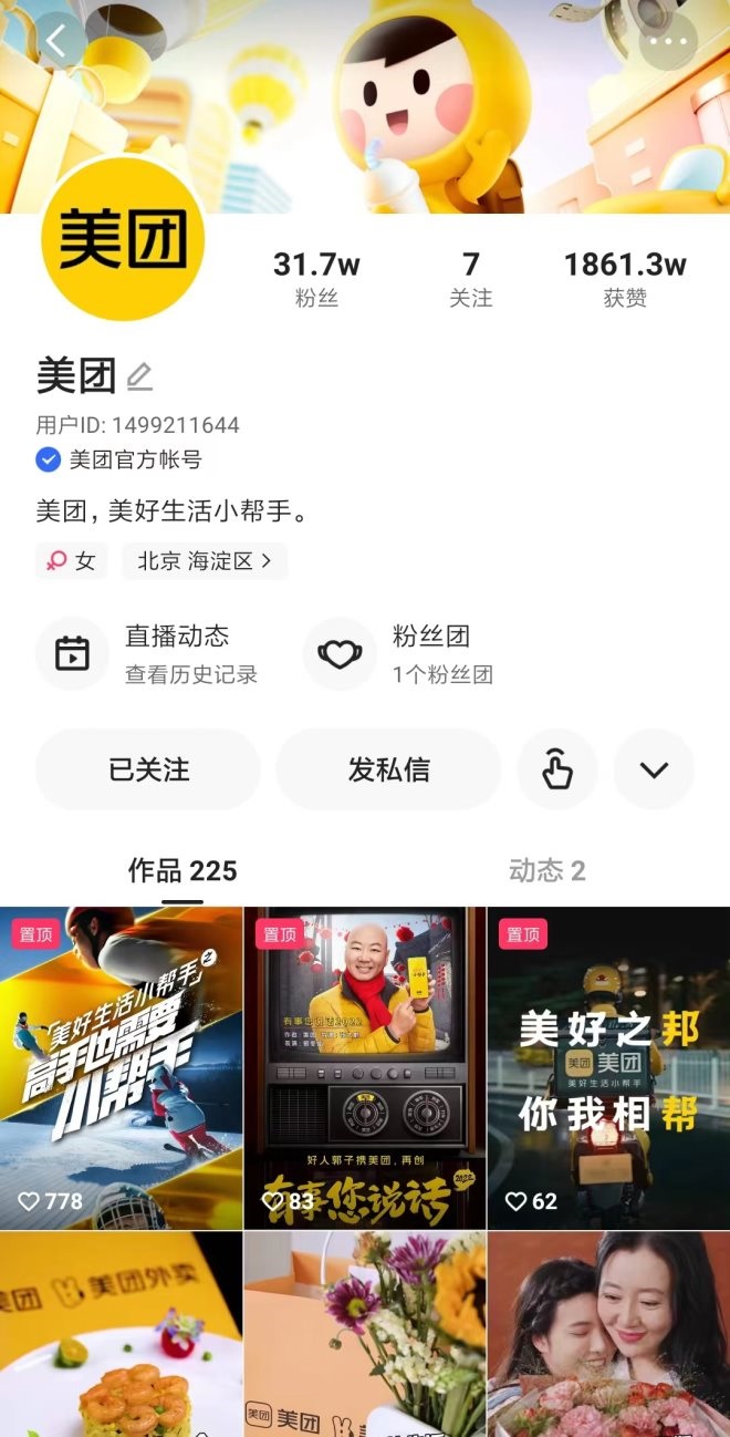 但上線(xiàn)近半年來(lái),美團(tuán)只在快手上直播過(guò)一場(chǎng)。截至目前,快手上的美團(tuán)官方賬號(hào)共發(fā)布225個(gè)作品,粉絲僅31.7萬(wàn)。