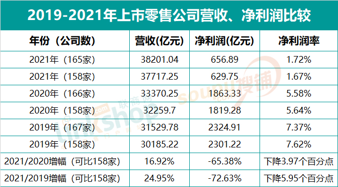 2021年與疫情前的2019年相比,零售上市公司數(shù)從167家減少到165家,營收從31529.78億元增長到38201.04億元,增幅為21.16%,凈利潤從2324.64億元下降到656.89億元,下降幅度為71.74%。一增一減,可以看出我國零售業(yè)上市公司三年來的總體態(tài)勢(shì)。