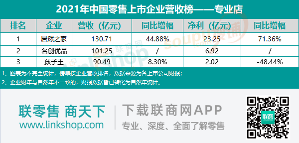 2021年零售上市公司排行榜單列了專業(yè)店業(yè)態(tài),除原有的居然之家外,還新增了名創(chuàng)優(yōu)品和孩子王。三家企業(yè)實(shí)現(xiàn)營收322.45億元,平均每個(gè)公司的營收超過百億元,實(shí)現(xiàn)凈利潤32.19億元,凈利潤率高達(dá)9.98%,為零售上市公司9大業(yè)態(tài)中凈利潤率最高的行業(yè)。