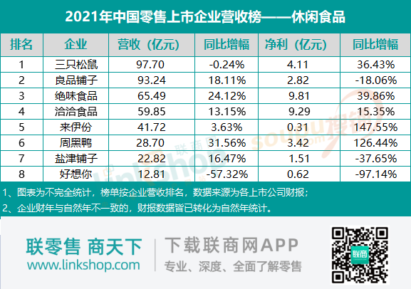 此外,6家公司的營收都有不同程度的增長,周黑鴨與絕味食品增長最高,分別為31.56%和24.12%,這與2021年高鐵等交通樞紐站點(diǎn)開放有關(guān)。良品鋪?zhàn)、鹽津鋪?zhàn)、洽洽食品的營收增幅在18.11%到13.15%之間。