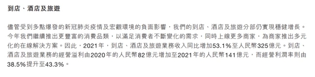 財報顯示,2021年,美團(tuán)到店及酒旅業(yè)務(wù)營收325億元,同比增長53.1%;全年經(jīng)營利潤為141億元,同比增長72%。從單純的數(shù)字來看,美團(tuán)起家的O2O業(yè)務(wù)不論是營收還是利潤都表現(xiàn)亮眼。