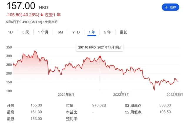事實上,5月4日美團(tuán)股價下跌并不是孤例,將時間拉長來看,自2021年11月16日達(dá)到297.4港元/股的高點(diǎn)后,美團(tuán)的股價就不斷下探,截至發(fā)稿,美團(tuán)股價僅為170港元/股,較半年前的高點(diǎn)下跌42%,近乎腰斬。