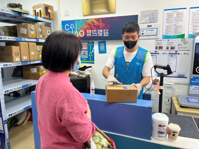 在杭州云谷公寓菜鳥驛站,家住附近的袁阿姨正通過(guò)菜鳥裹裹預(yù)約的到站寄件,給在外地工作的女兒寄快遞。