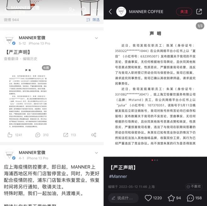 5月10日,兩位Manner咖啡在職員工和一位離職員工通過小紅書平臺“爆料”Manner咖啡4月工資問題,隨即引爆了網(wǎng)絡(luò)上對Manner“討伐”的導(dǎo)火索。隨后,Manner也不甘示弱,分別在微博及小紅書平臺發(fā)文回應(yīng),針對不實信息發(fā)布,要追究員工刑事責(zé)任和民事責(zé)任。