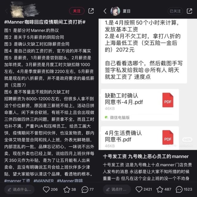 值得注意的是,在“疫情員工工資打折”事件發(fā)酵的一周,“夏目”的帖子依然掛在小紅書平臺上,有部分員工開始刪文、注銷賬號,也有部分員工開始匿名發(fā)文并在社交媒體上發(fā)言,矛頭更是直指Manner管理以及排班上的一系列問題。