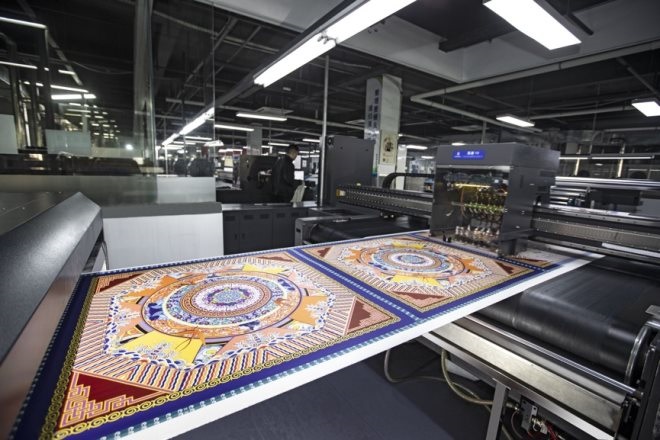 杭州市錢塘區(qū)幸福南路2號(hào),萬事利絲綢文化創(chuàng)意園區(qū)里一臺(tái)臺(tái)智能數(shù)碼印花機(jī)正高速運(yùn)行,電腦上實(shí)時(shí)顯示的訂單新數(shù)據(jù)也在不斷跳動(dòng)。
