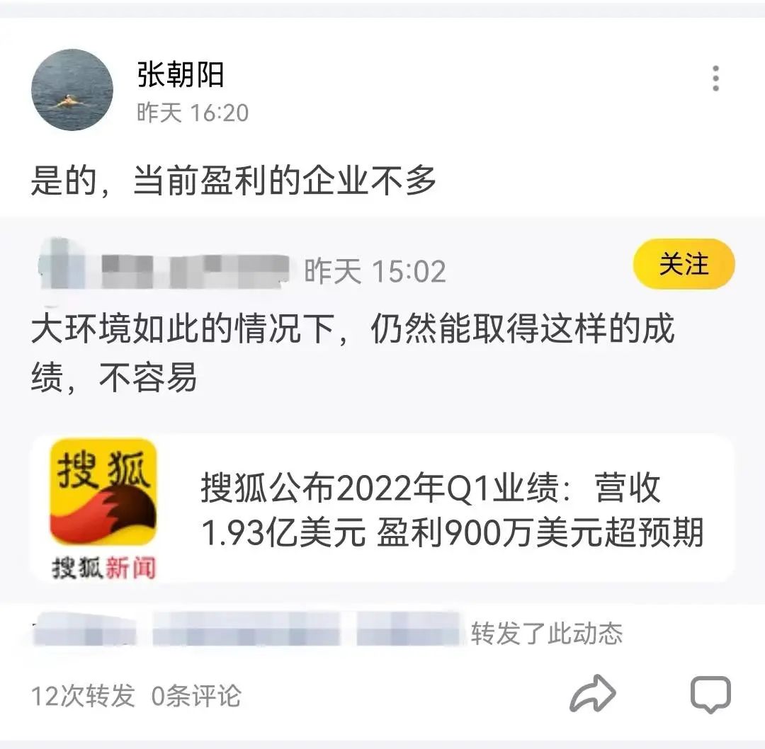 張朝陽的活躍,也不僅僅在搜狐號上。一季度的財報出來后,搜狐旗下狐友APP上有網(wǎng)友評論,“大環(huán)境如此的情況下,仍然能取得這樣的成績不容易”。張朝陽轉(zhuǎn)發(fā)稱,“是的,當(dāng)前盈利的企業(yè)不多”,盡管搜狐沒有回到舞臺中央,但或許張朝陽對當(dāng)前狀態(tài)是滿意的。