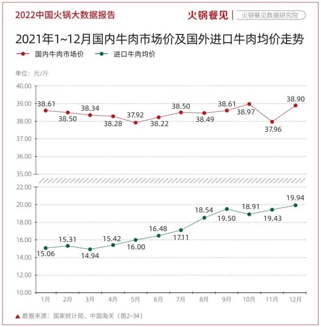 據(jù)《2022中國火鍋大數(shù)據(jù)報告》,2021年,我國國內(nèi)牛肉市場價呈上漲趨勢,已從1月份的38.61元/斤增長至12月的38.9元/斤。另據(jù)國家統(tǒng)計局最新數(shù)據(jù),2022年3月,國內(nèi)牛肉市場價已經(jīng)漲至39元/斤。