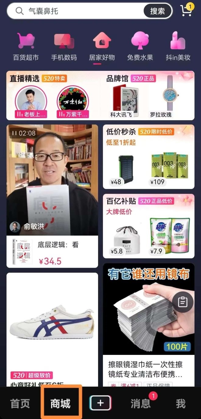 如今的抖音商城界面,首頁配備了“直播精選”“品牌館”“低價秒殺”等類目,已與傳統(tǒng)的貨架式電商別無二致。顛覆了以往抖音“貨找人”的模式,轉(zhuǎn)而依賴起用戶的主動搜索,即“人找貨”。
