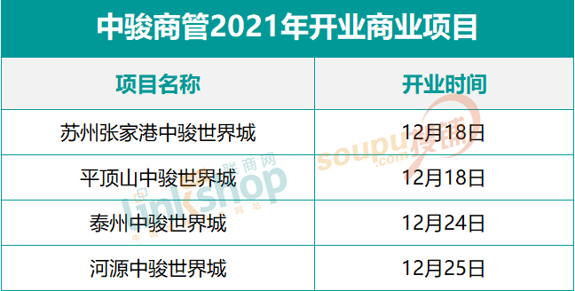 2021年全年,中駿商管新開四個中駿世界城項目均在12月單月完成,且河南平頂山、江蘇張家港、江蘇泰州、廣東河源均以近100%滿鋪開業(yè)的出色成績引起行業(yè)廣泛關注。據(jù)報道,截至2021年年底,中駿商管旗下中駿世界城已布局全國33個城市,在建及開業(yè)項目39個。