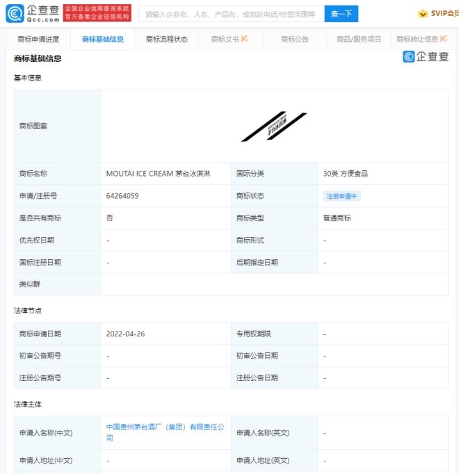 企查查APP顯示,4月26日,中國貴州茅臺酒廠(集團(tuán))有限責(zé)任公司申請注冊“MOUTAI ICE CREAM 茅臺冰淇淋”商標(biāo),國際分類為30類方便食品。商標(biāo)狀態(tài)為注冊申請中。