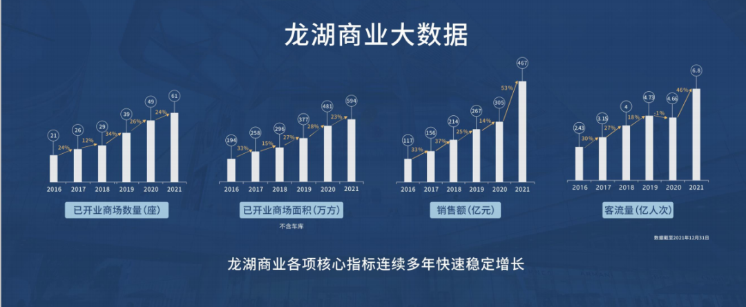 在2021年,龍湖商業(yè)新開(kāi)12座商場(chǎng),累計(jì)開(kāi)業(yè)商場(chǎng)總數(shù)達(dá)到61座,二十年的經(jīng)驗(yàn)積累與團(tuán)隊(duì)歷練,開(kāi)啟輕重并舉模式,在全國(guó)商業(yè)地產(chǎn)百?gòu)?qiáng)中位列第五。