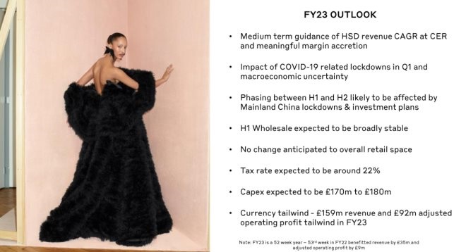 Burberry正積極應(yīng)對當下的宏觀經(jīng)濟環(huán)境造成的短期不確定性和通貨膨脹的負面影響;2022年5月6日即期匯率,Burberry預(yù)期2023財年在貨幣利好的情況下將實現(xiàn)1.59億英鎊營收和9200萬英鎊調(diào)整后運營利潤。