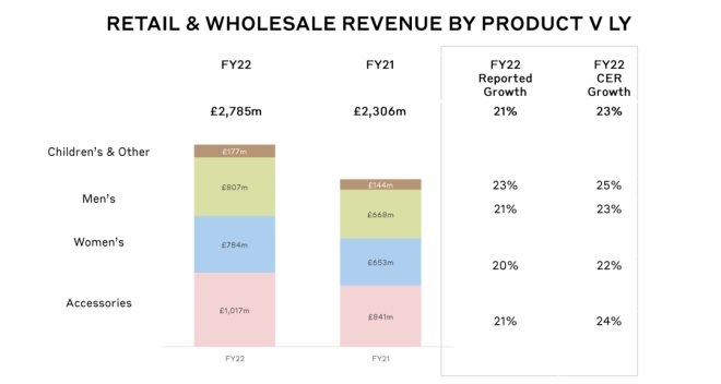 女士服裝銷售額7.84億英鎊,(按固定匯率,以下皆同)同比增長22%;