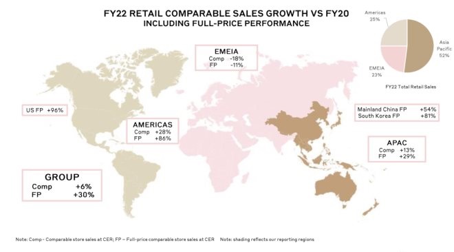 亞太區(qū)銷售額較2020財年增長29%。韓國正價可比門店銷售額較2020財年增長81%。雖受到某些地區(qū)疫情封控影響(尤其在3月),中國大陸市場的銷售額較2020財年增長仍達到54%。